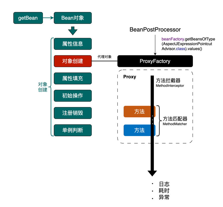 beanFactory.getBeansOfType 获取 AspectJExpressionPointcutAdvisor 开始。 - 获取了 advisors 以后就可以遍历相应的 AspectJExpressionPointcutAdvisor 填充对应的属性信息,包括:目标对象、拦截方法、匹配器,之后返回代理对象即可。
