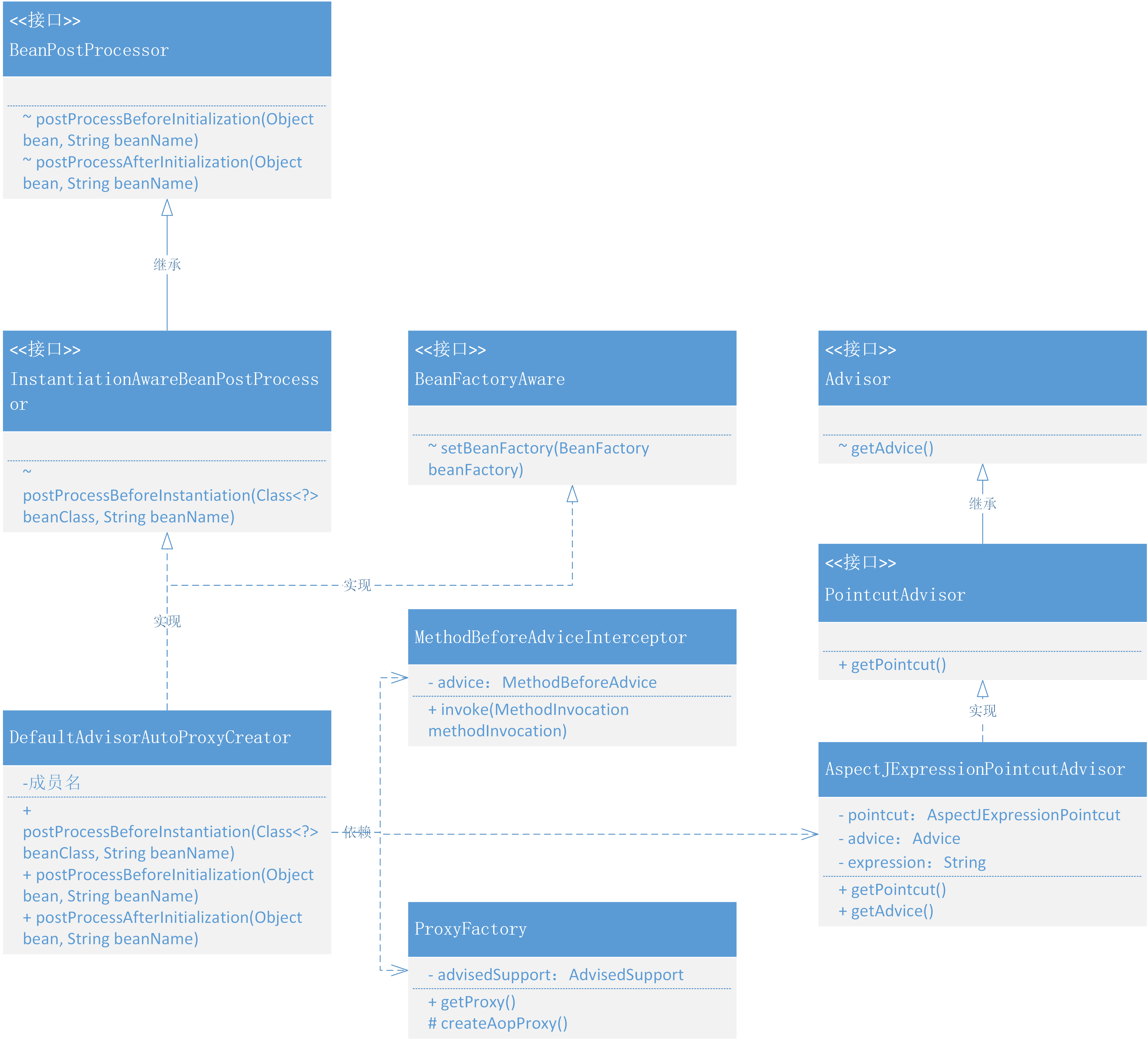AOP 动态代理融入到Bean的生命周期中类关系,如图: