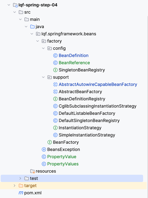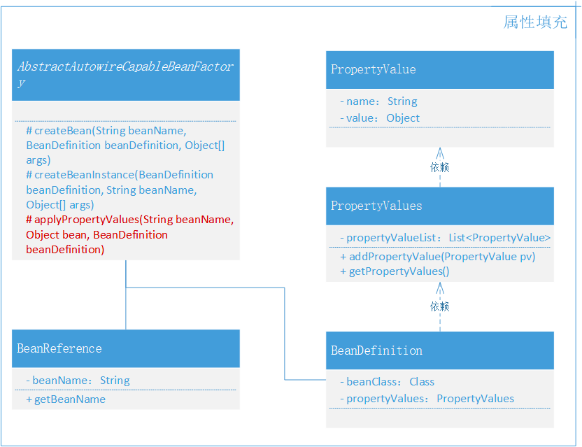 - 新增加3个类,BeanReference(类引用)、PropertyValue(属性值)、PropertyValues(属性集合),分别用于类和其他类型属性填充操作。