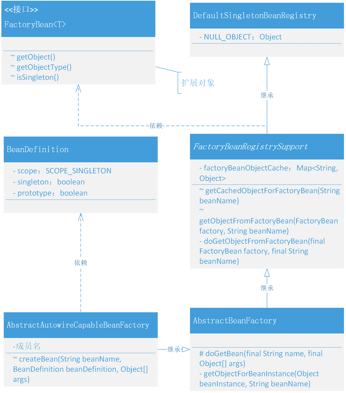 FactoryBean 的 getObject 方法中获取对象的功能即可,这样所有实现此接口的对象类,就可以扩充自己的对象功能了。整体设计结构如下图: