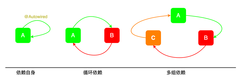 - 循环依赖主要分为这三种,自身依赖于自身、互相循环依赖、多组循环依赖。