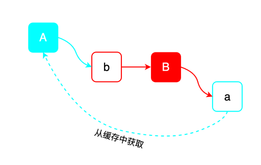 B对象的属性进行填充,恰好这会可以从缓存中拿到半成品的A对象,那么这个时候B对象的属性就填充完了。 - 最后返回来继续完成